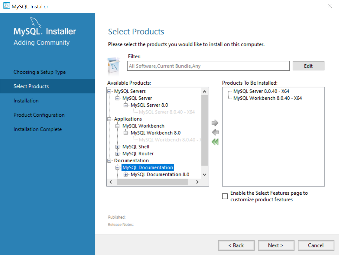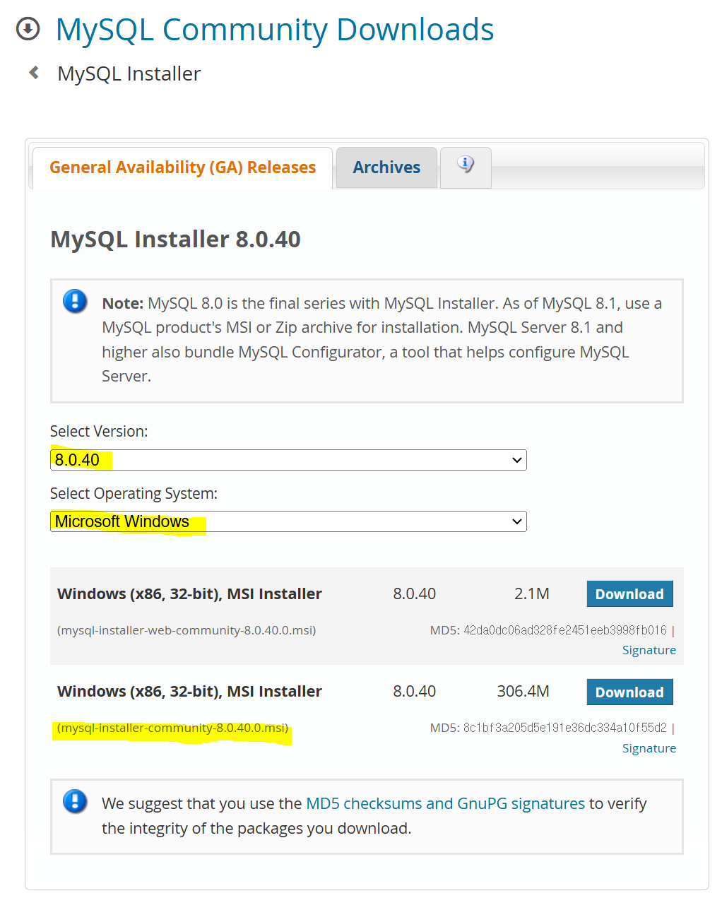 MySQL Installer 8.0.40 Note: MySQL 8.0 is the final series with MySQL Installer. As of MySQL 8.1, use a MySQL product's MSI or Zip archive for installation. MySQL Server 8.1 and higher also bundle MySQL Configurator, a tool that helps configure MySQL Serve