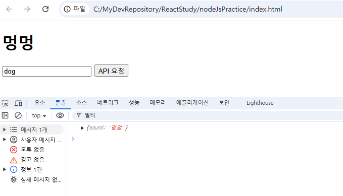 fetch에 의해 http://localhost:3000/sound/dog 가 호출이 된다.