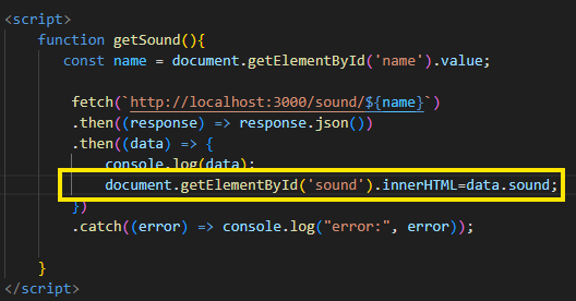 fetch의 then 구절의 data 는 {'sound':'멍멍'} 이고,