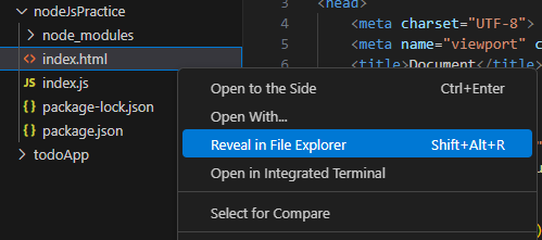 실습을 하던 폴더 nodeJsPractice 아래에 index.html 파일을 생성한다.