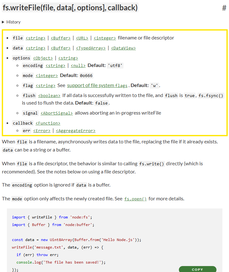 fs.writeFile 함수는 file, data, callback이 필수 매개변수이고,