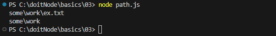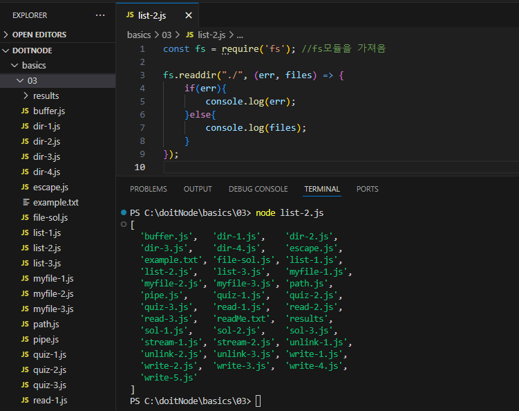 list-2.js 파일이 있는 현재 경로인 C:\doitNode\basics\03 폴더에 있는 모든 파일들이 콘솔창에 찍혔다.