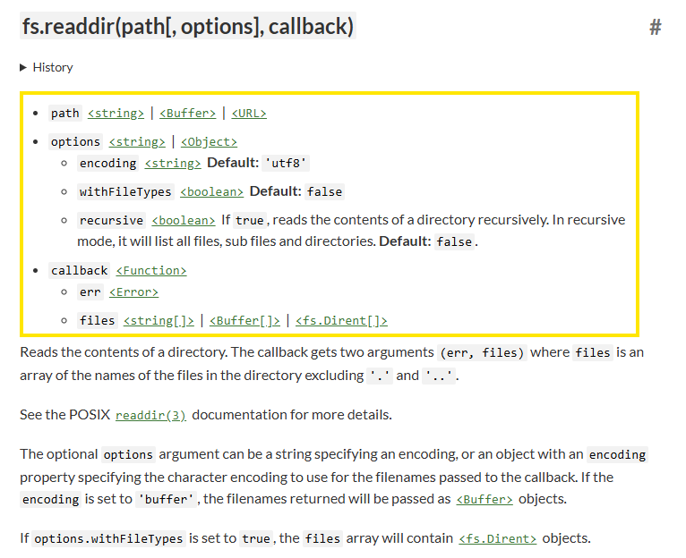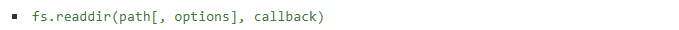 fs.readdir 함수의 파라미터 path, options, callback 에 대한 내용을 확인할 수 있다.
