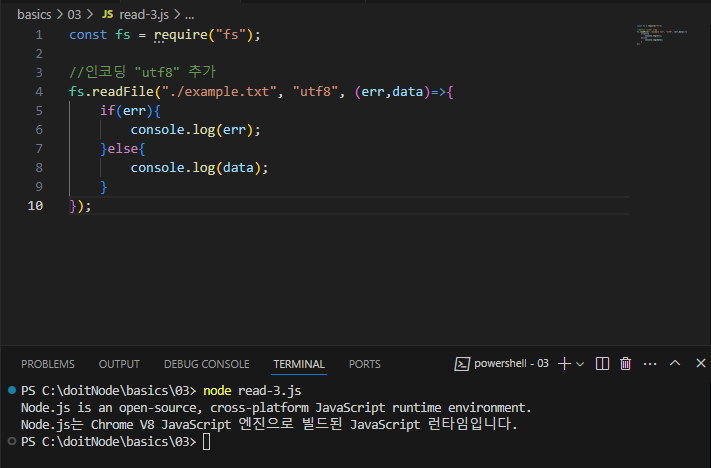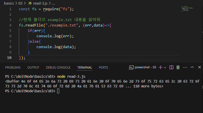 read-3.js와 같은 폴더(./) 밑에 있는 example.txt 파일의 내용이 콘솔창에 잘 찍혔다.