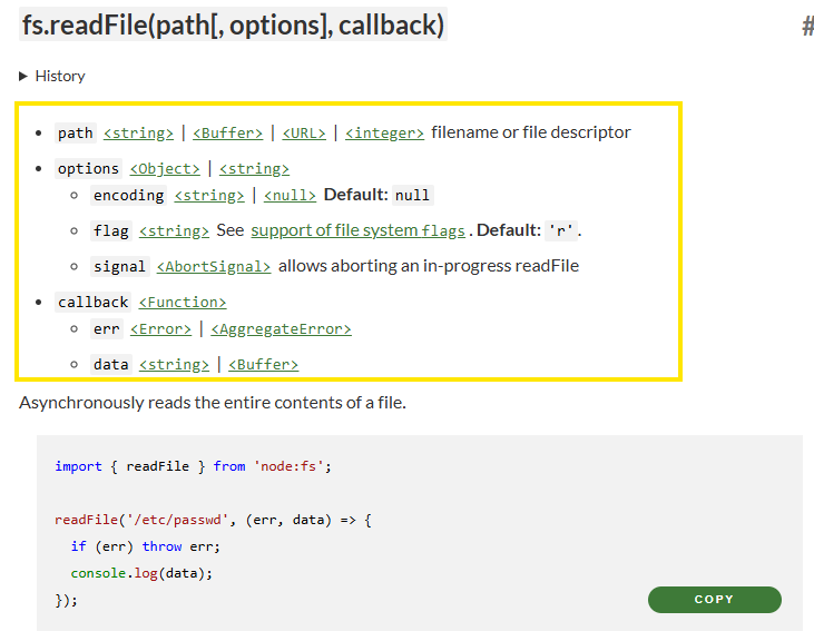 fs.readFile 함수는 path, callback이 필수 매개변수이고,