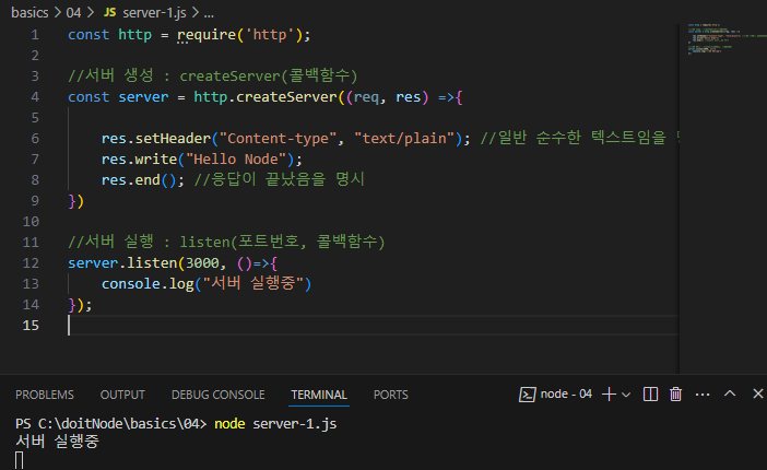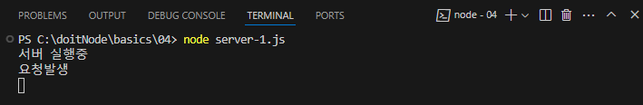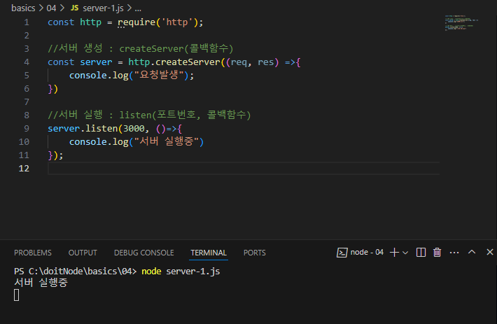 파일을 실행하면 server.listen의 콜백함수가 작동하여 "서버 실행중"이라는 문구가 콘솔창에 찍힌다.