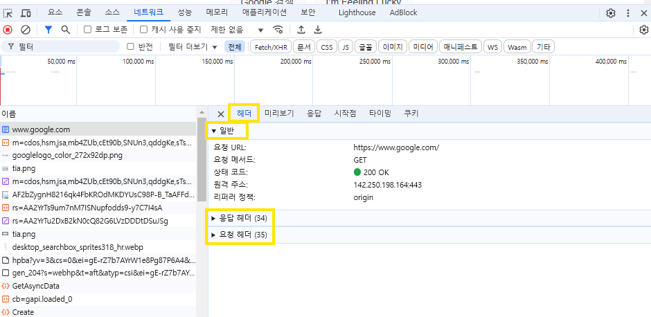 위 이미지에 [헤더>일반>원격 주소]에 142.250.198.164:443 이라고 적혀 있다.