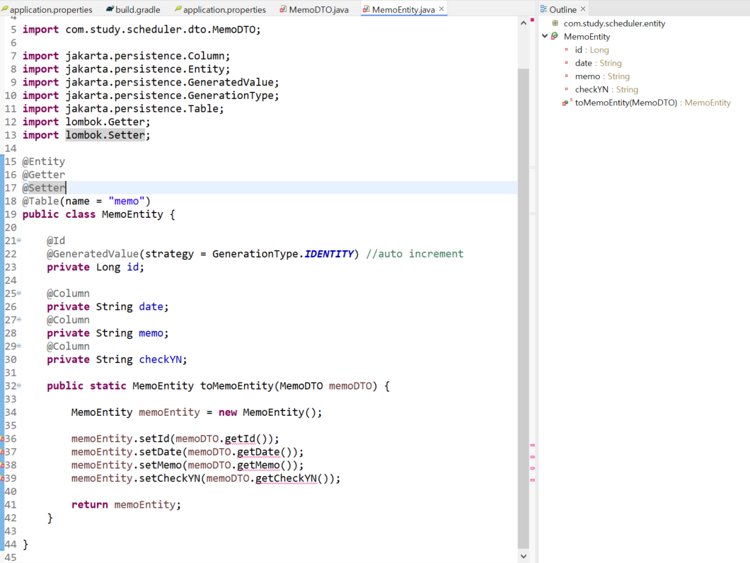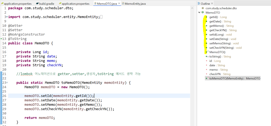 STS를 재실행하니 Getter, Setter가 정상적으로 잘 만들어졌고,