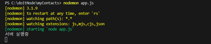 nodemon을 설치했기 때문에 node app.js 가 아닌 nodemon app.js 로 실행하였다.