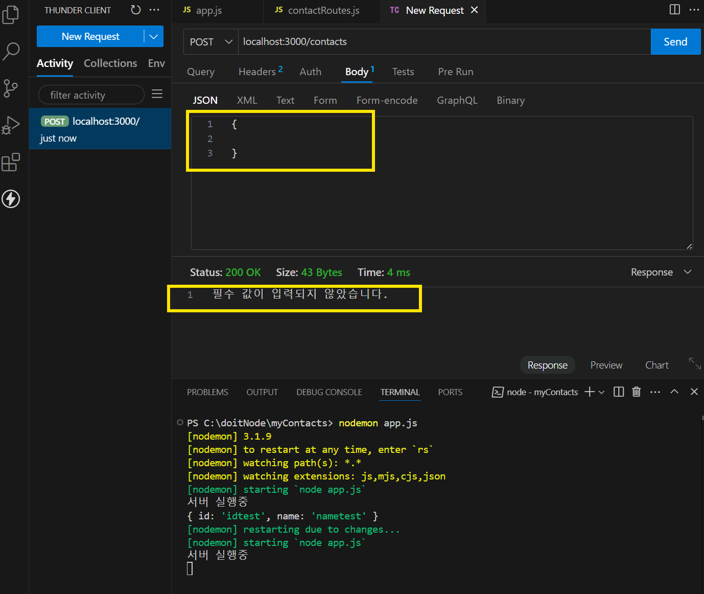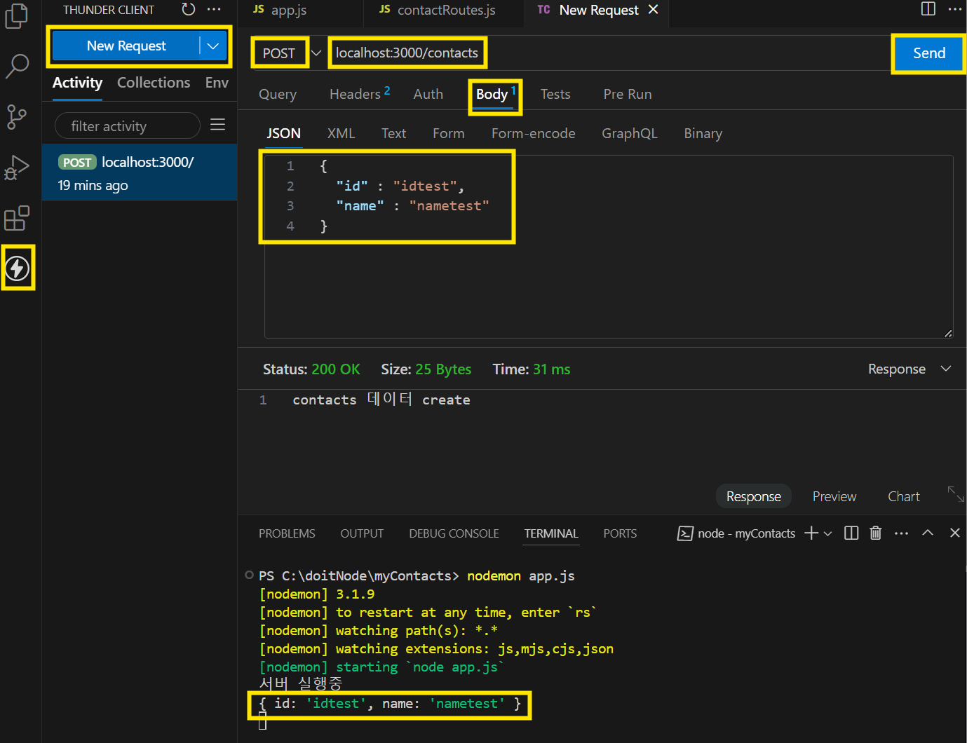 localhost:3000/contacts로 post 요청할 때, 요청의 바디본문(req.body) 를 콘솔창에 찍어보려고 한다.
