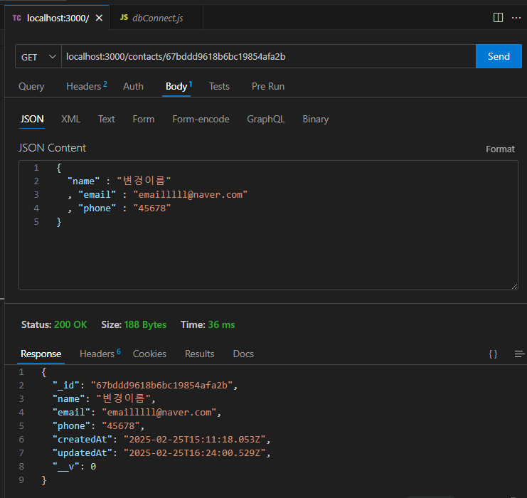 PUT localhost:3000/contacts/:id 로 name, email, phone 변경 후,