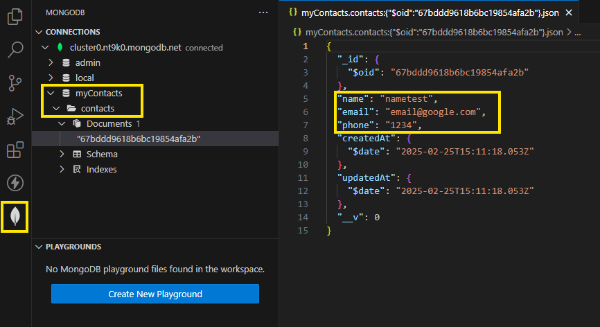 POST 요청 테스트 후 확인해보니 myContacts 라는 데이터베이스와 그 아래 contacts 컬렉션이 생성되었다.