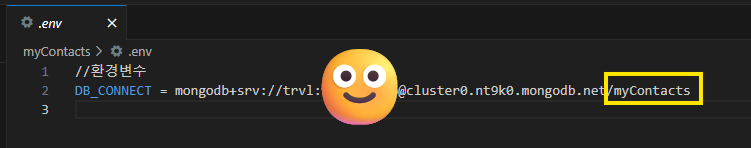 .env 파일에 DB_CONNECT 라는 환경변수를 등록하였고, 커넥션 주소 뒤에 /myContacts 라고 작성하였다.